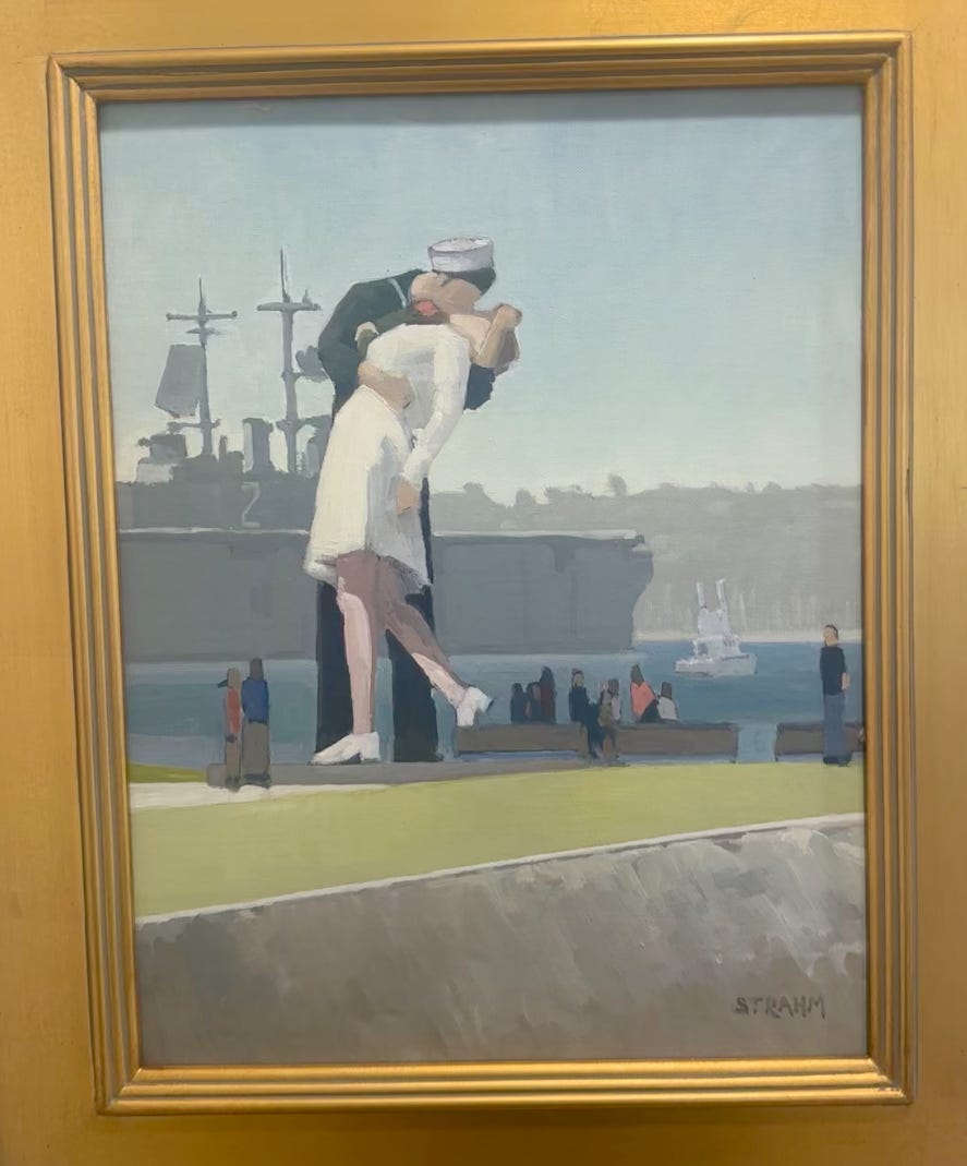 We recently added a wonderful original painting by a local San Diego artist, Paul Strahm. It is of the statue in San Diego (next to the USS Midway), representing the famous Alfred Eisenstaedt photo taken in 1945.